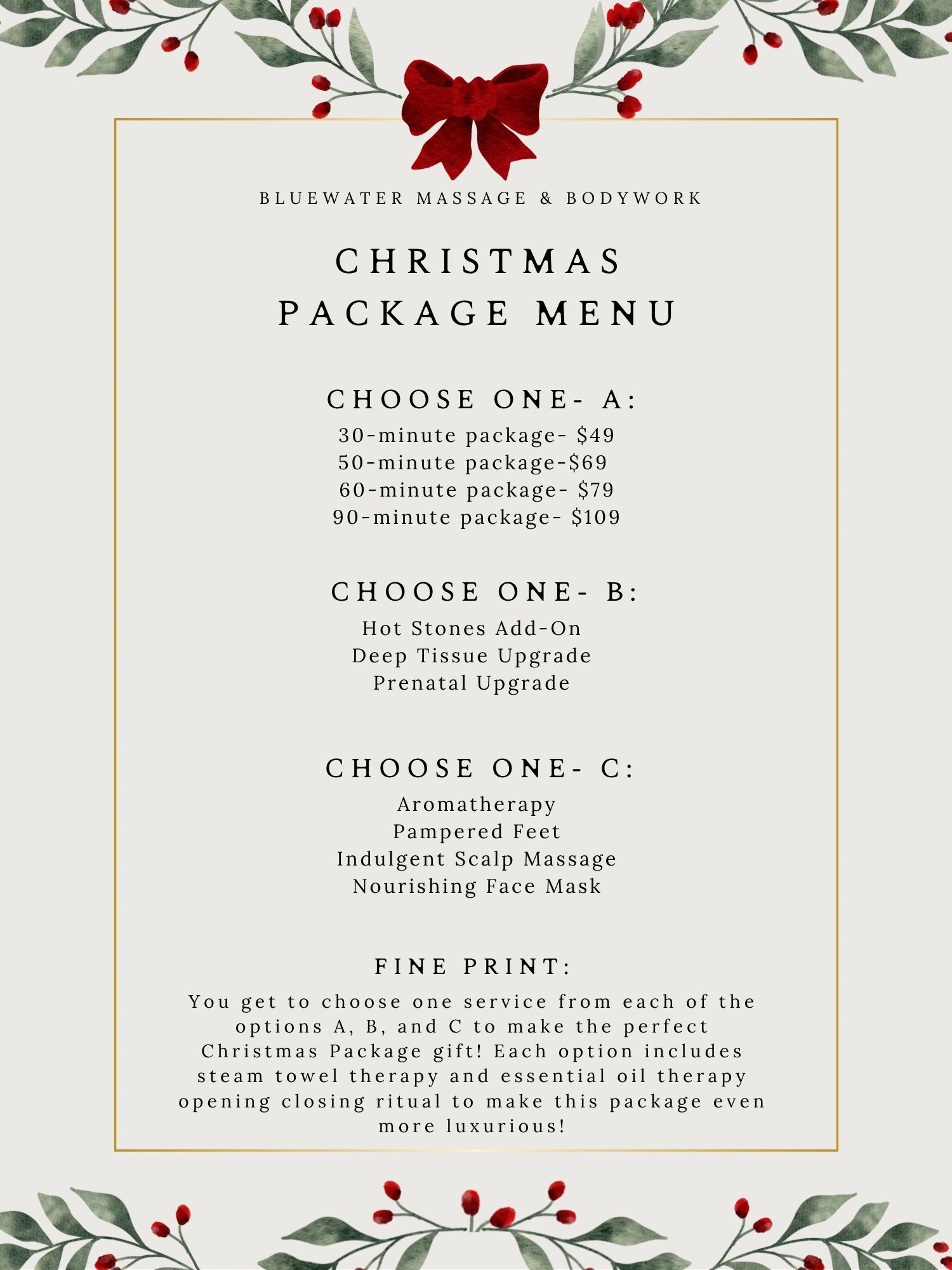 om now until December 25 you can purchase as many package gift certificates as you'd like! You may also book these services for yourself to enjoy!